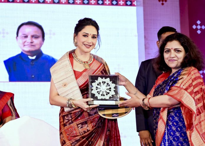 Bhubaneswar: Bollywood actor Madhuri Dixit during an event on National Handloom Day, at Janata Maidan in Bhubaneswar, Thursday, Aug. 7, 2025. (PTI Photo) (PTI08_07_2025_000258B) *** Local Caption ***