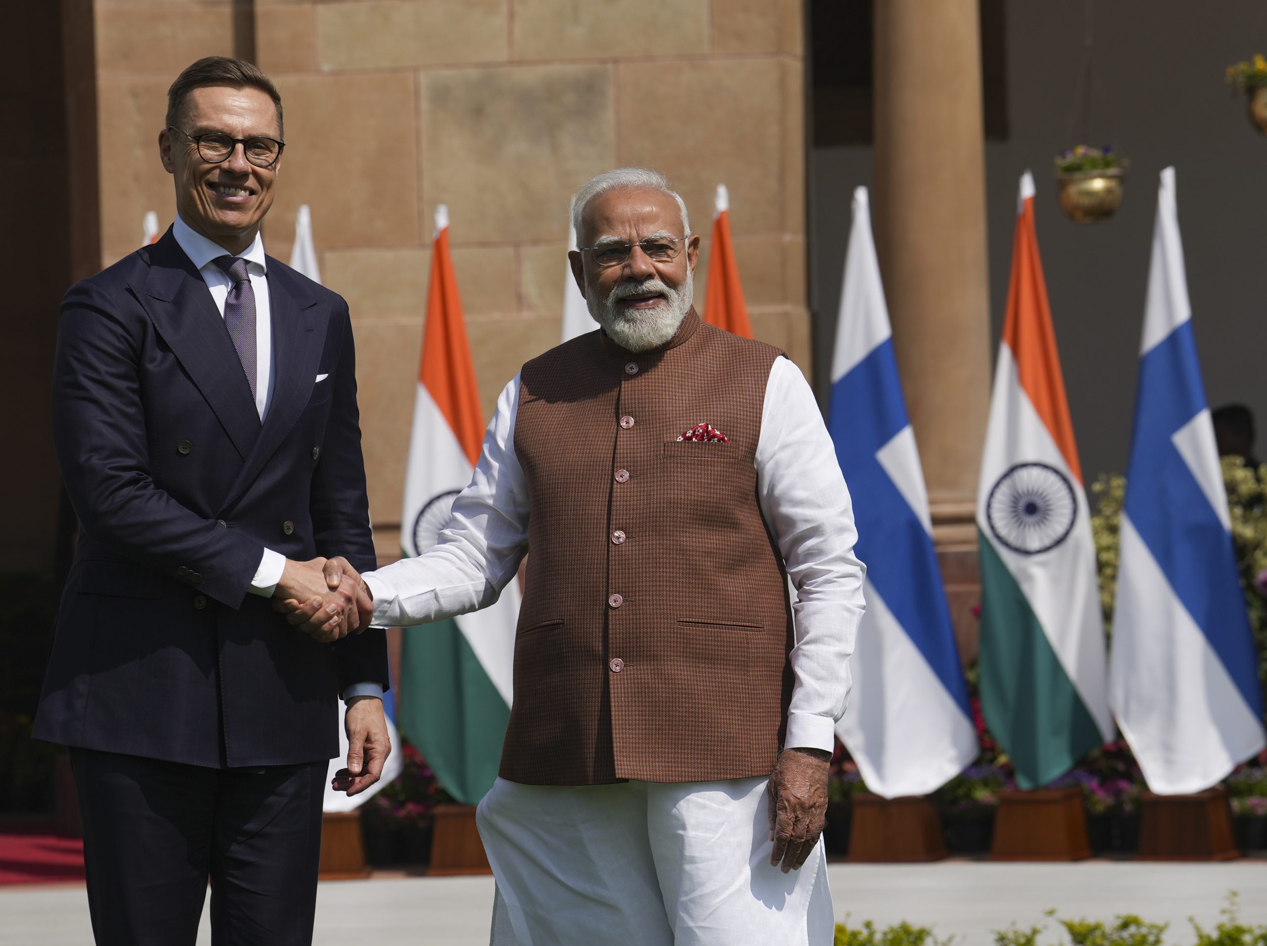 New Delhi: Prime Minister Narendra Modi, right, exchanges a handshake with Finland President Alexander Stubb, at Hyderabad House in New Delhi, Thursday, March 5, 2026. (PTI Photo/Kamal Kishore) (PTI03_05_2026_000087B)