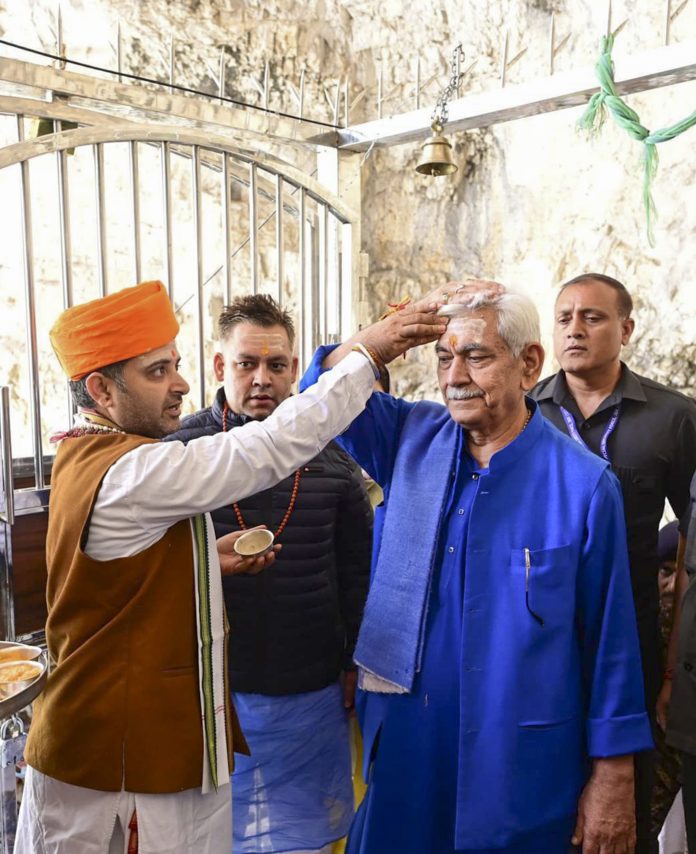**EDS: THIRD PARTY IMAGE** In this image released by @OfficeOfLGJandK via X on June 11, 2025, J&K LG Manoj Sinha performs 'Pratham Puja' at the holy Amarnath cave, marking the ceremonial beginning of the annual Amarnath Yatra. (@OfficeOfLGJandK via PTI Photo)(PTI06_11_2025_000142B)