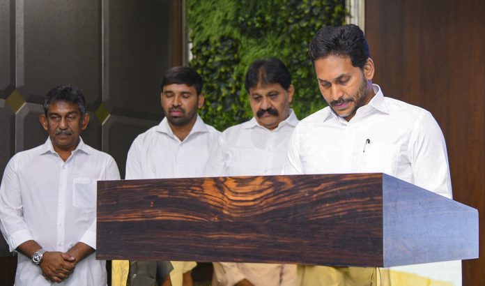 **EDS: THIRD PARTY IMAGE** In this image released by @YSRCParty via X on April 24, 2025, YSR Congress Party chief YS Jagan Mohan Reddy observes a moment of silence to pay respects to the victims of the Pahalgam terror attack. (@YSRCParty via PTI Photo)(PTI04_24_2025_000300B)