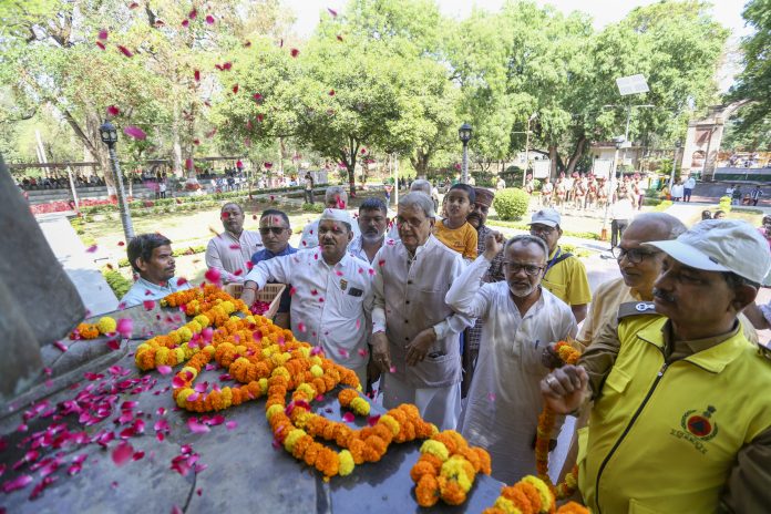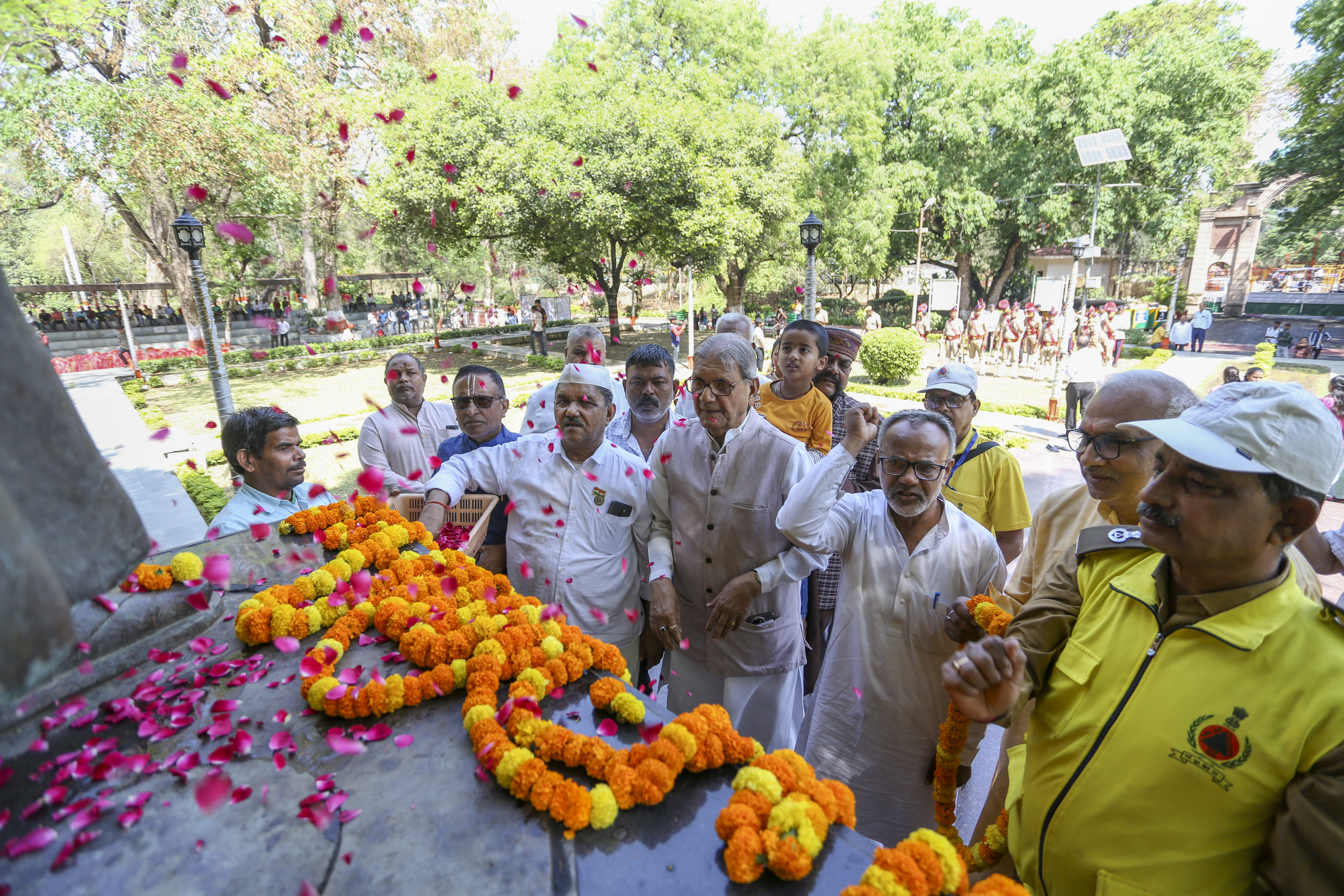 Prayagraj: People pay tribute to the victims of the Jallianwala Bagh massacre on its anniversary, at Chandra Shekhar Azad Park, in Prayagraj, Sunday, April 13, 2025. (PTI Photo)(PTI04_13_2025_000118B)