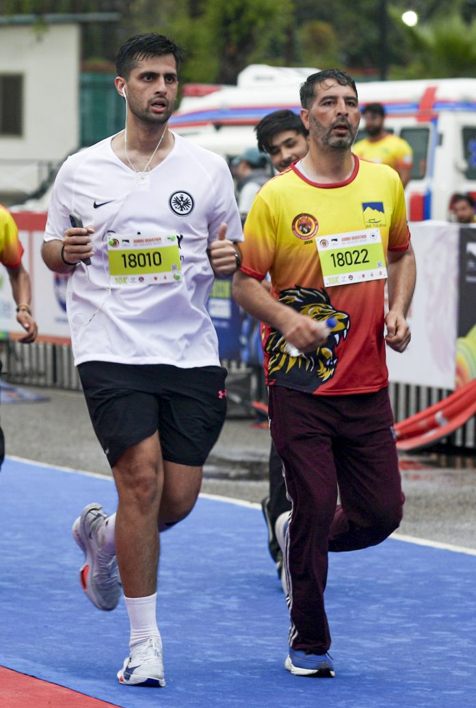 Jammu: Jammu and Kashmir Chief Minister Omar Abdullah’s son Zamir Abdullah, left, participates in the ‘Jammu Marathon 2026’, in Jammu, Sunday, March 29, 2026. (PTI Photo)(PTI03_29_2026_000019B)