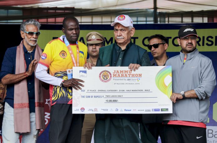 Jammu: Jammu and Kashmir Lieutenant Governor Manoj Sinha with Model and Jammu Marathon brand ambassador Milind Soman during a prize distribution ceremony for winners of the marathon, in Jammu, Sunday, March 29, 2026. (PTI Photo)(PTI03_29_2026_000052B)