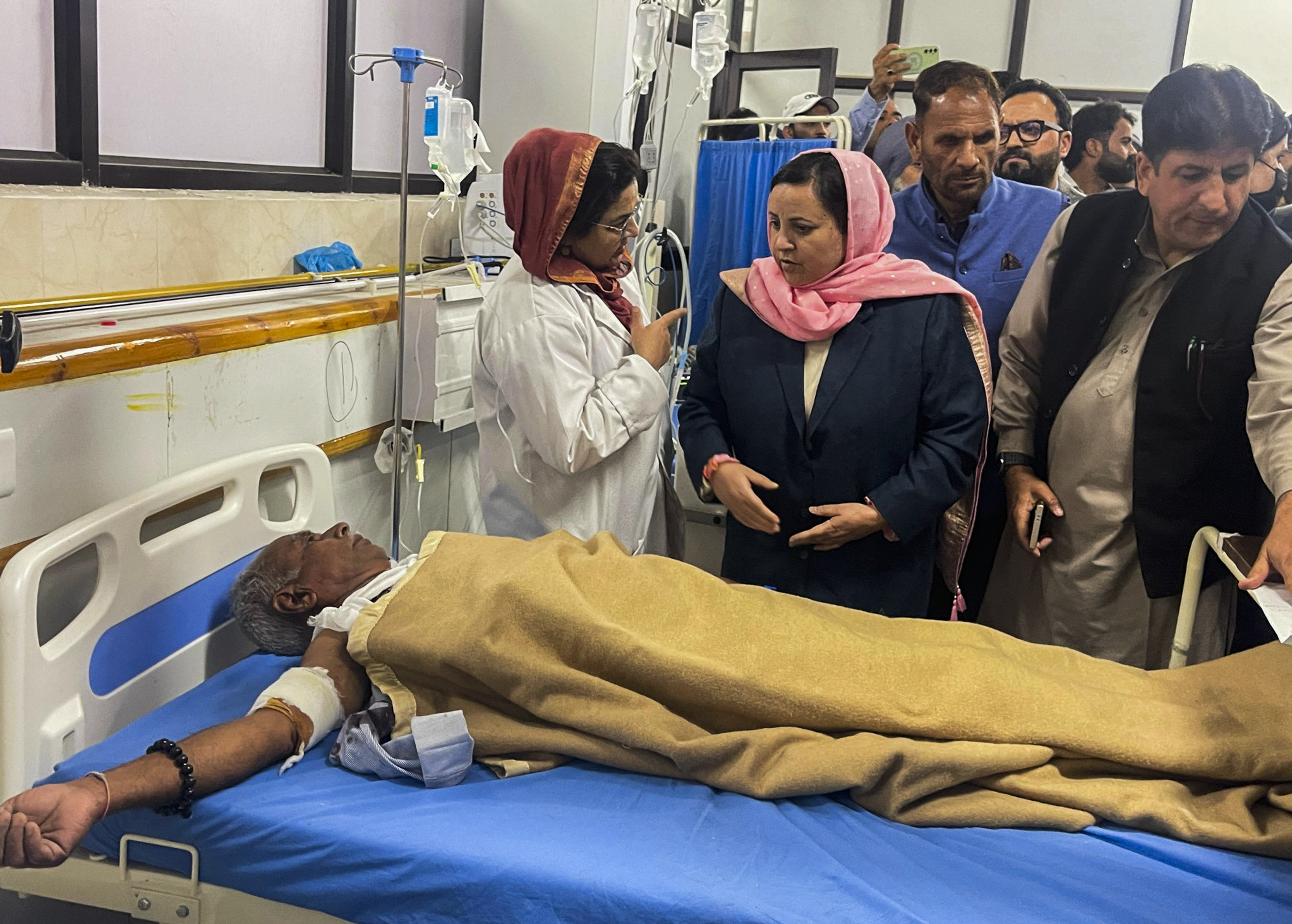 **EDS: THIRD PARTY IMAGE** In this image released by @diprjk via X on April 22, 2025, J&K Minister Sakina Itoo meets an injured receiving treatment at a hospital, after terrorists attacked a group of tourists at Pahalgam, in Anantnag district, Jammu & Kashmir. At least 12 people suffered injuries in the attack, according to officials. (@diprjk on X via PTI Photo)(PTI04_22_2025_000407B)