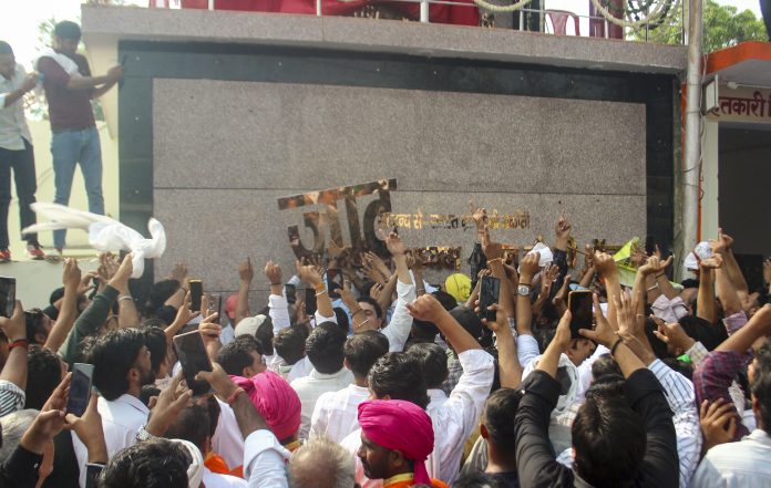 Meerut: Members of the Jat community stage a protest over the removal of the word “Jat” from the foundation wall of Maharaja Surajmal’s statue, in Meerut, Uttar Pradesh, Sunday, March 29, 2026. (PTI Photo) (PTI03_29_2026_000506B)