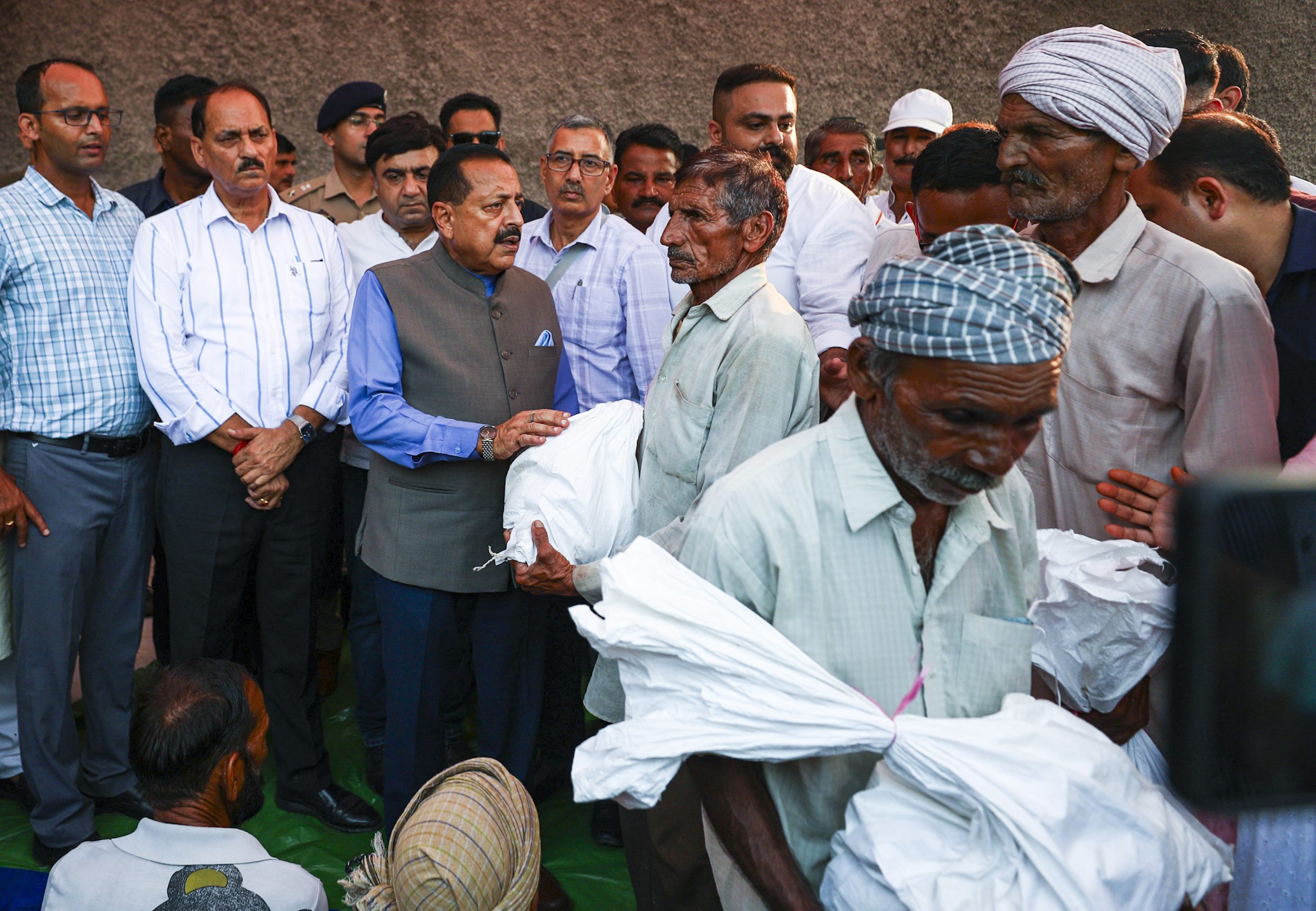 Kathua: Union Minister of State Jitendra Singh distributes relief material to residents of a flood-affected area, at Hiranagar village in Kathua district, Jammu and Kashmir, Friday, Sept. 12, 2025. (PTI Photo)(PTI09_12_2025_000427B)