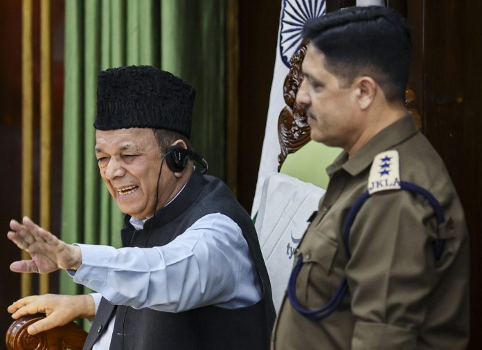 Jammu: Jammu and Kashmir Legislative Assembly Speaker Abdul Rahim Rather conducts proceedings in the House during the Budget session of the J&K Assembly, in Jammu, Monday, March 30, 2026. (PTI Photo)(PTI03_30_2026_000034B)