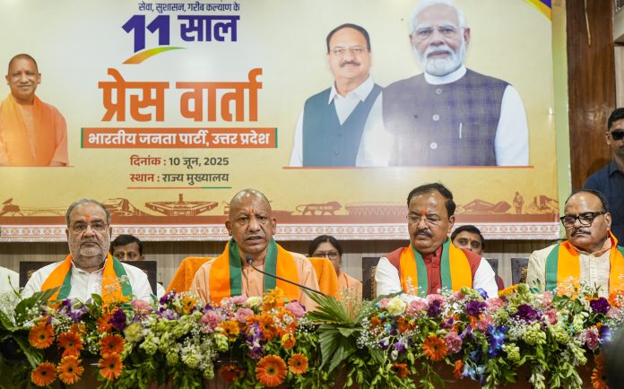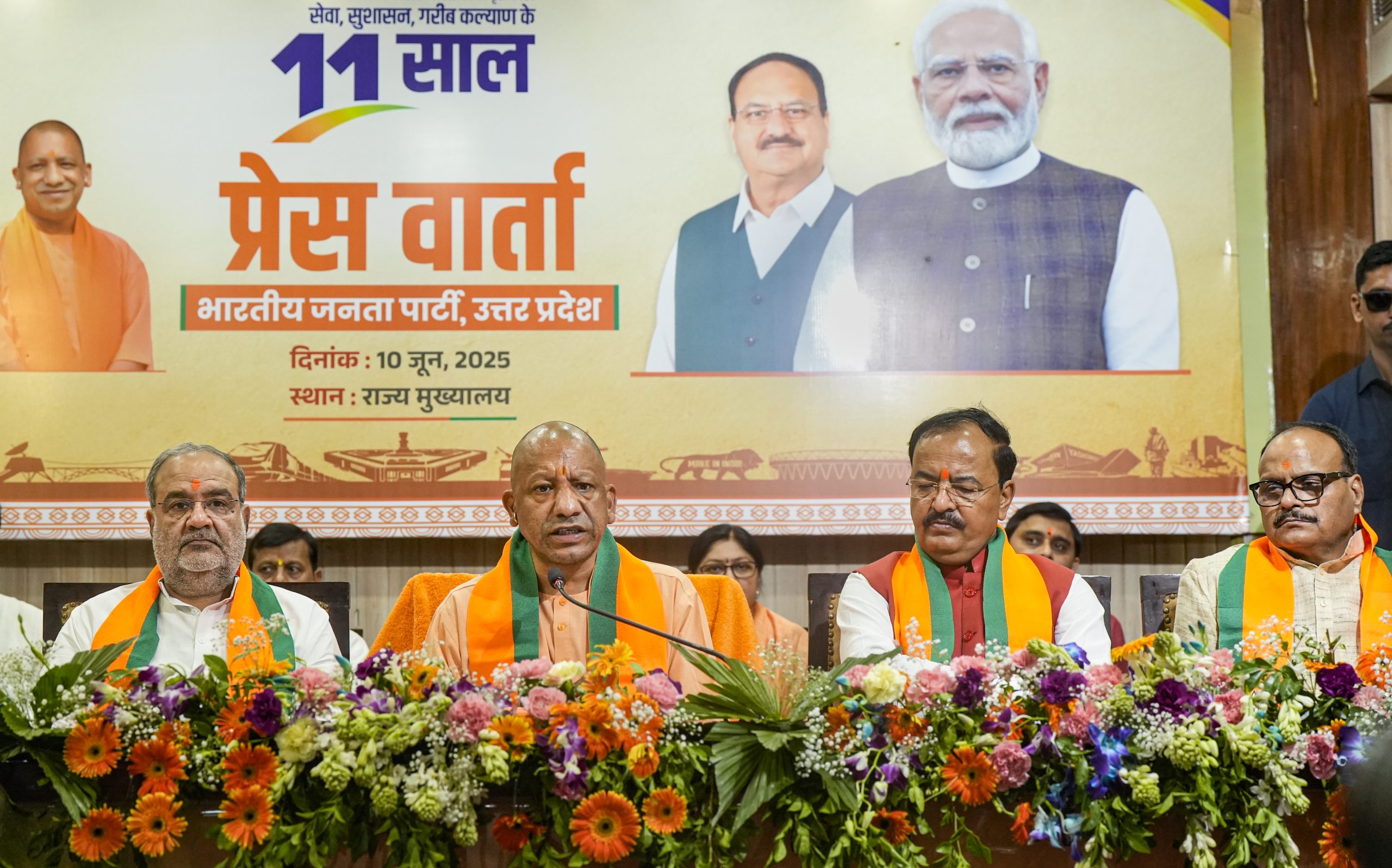 Lucknow: Uttar Pradesh Chief Minister Yogi Adityanath with Deputy Chief Ministers Brajesh Pathak and Keshav Prasad Maurya during a press conference on completion of 11 years of the NDA government under the leadership of Prime Minister Narendra Modi, at BJP office, in Lucknow, Tuesday, June 10, 2025. (PTI Photo/Nand Kumar)(PTI06_10_2025_000084B)