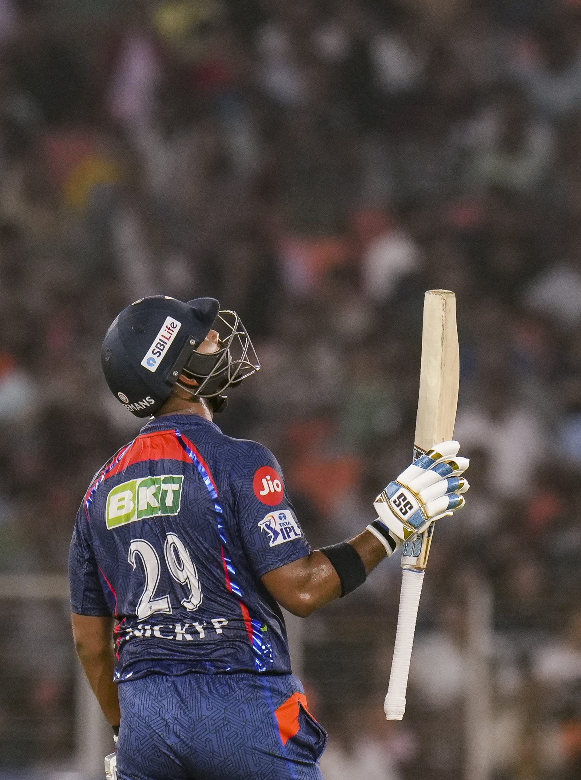 Ahmedabad: LSG's Mitchell Nicholas Pooran celebrates his fifty runs during the IPL 2025 cricket match between Gujarat Titans and Lucknow Super Giants at the Narendra Modi Stadium in Ahmedabad, Thursday, May 22, 2025. (PTI Photo/Shahbaz Khan) (PTI05_22_2025_000529B)