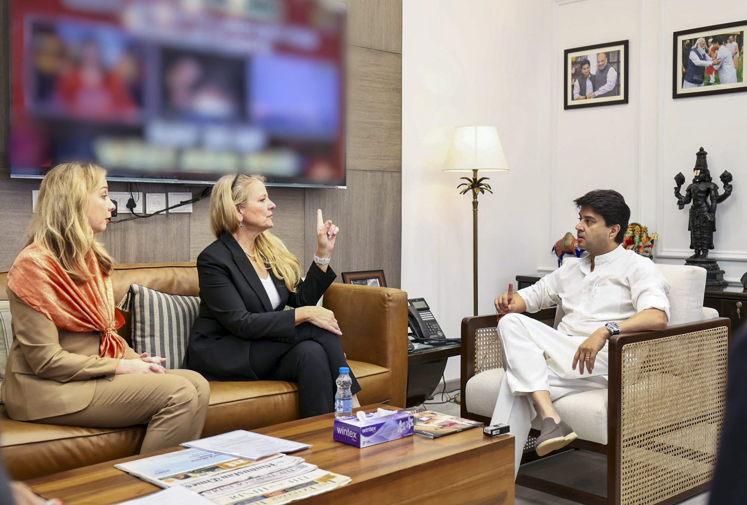 **EDS: THIRD PARTY IMAGE** In this image posted on April 1, 2026, Union Minister for Communications Jyotiraditya M. Scindia with SpaceX President & COO Gwynne Shotwell and Starlink Global Business Vice President Lauren Dreyer during a meeting. (@JM_Scindia/X via PTI Photo) (PTI04_01_2026_000337B)