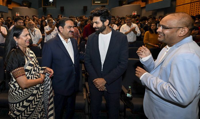**EDS: THIRD PARTY IMAGE** In this image posted on Oct. 11, 2025, Adani Group Chairman Gautam Adani, his wife Priti Adani and Bollywood actor Kartik Aaryan during an event at Whistling Woods International, in Mumbai. (@AdaniOnline/X via PTI Photo)(PTI10_11_2025_000530B)