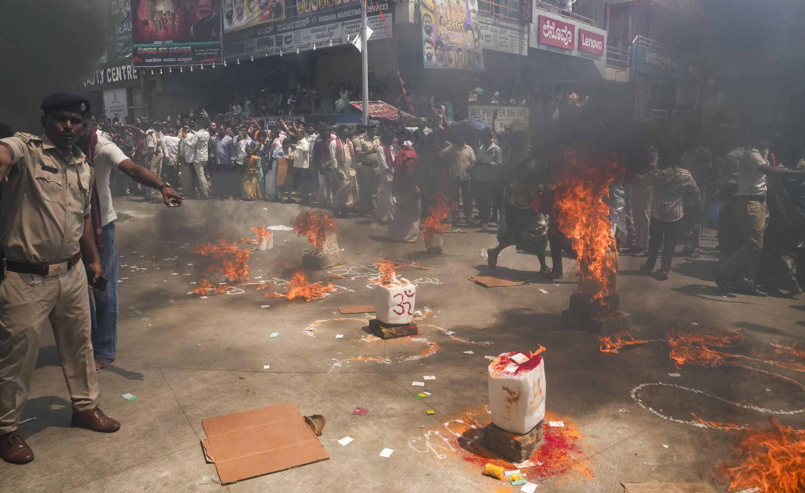 Bengaluru: People gather near the burning camphor as part of rituals during the �Karaga� festival, marking the homecoming of Draupadi, near Sri Dharmaraya Swamy Temple in Bengaluru, Wednesday, April 1, 2026. (PTI Photo/Shailendra Bhojak) (PTI04_01_2026_000262B)