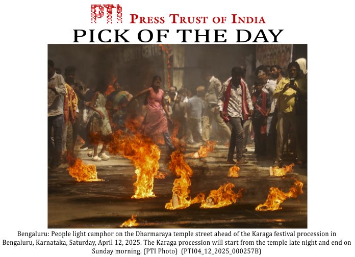 PLS TAKE NOTE OF THIS PTI PICK OF THE DAY::: Bengaluru: People light camphor on the Dharmaraya temple street ahead of the Karaga festival procession in Bengaluru, Karnataka, Saturday, April 12, 2025. The Karaga procession will start from the temple late night and end on Sunday morning. (PTI Photo) (PTI04_12_2025_000257B)(PTI04_12_2025_000495B)
