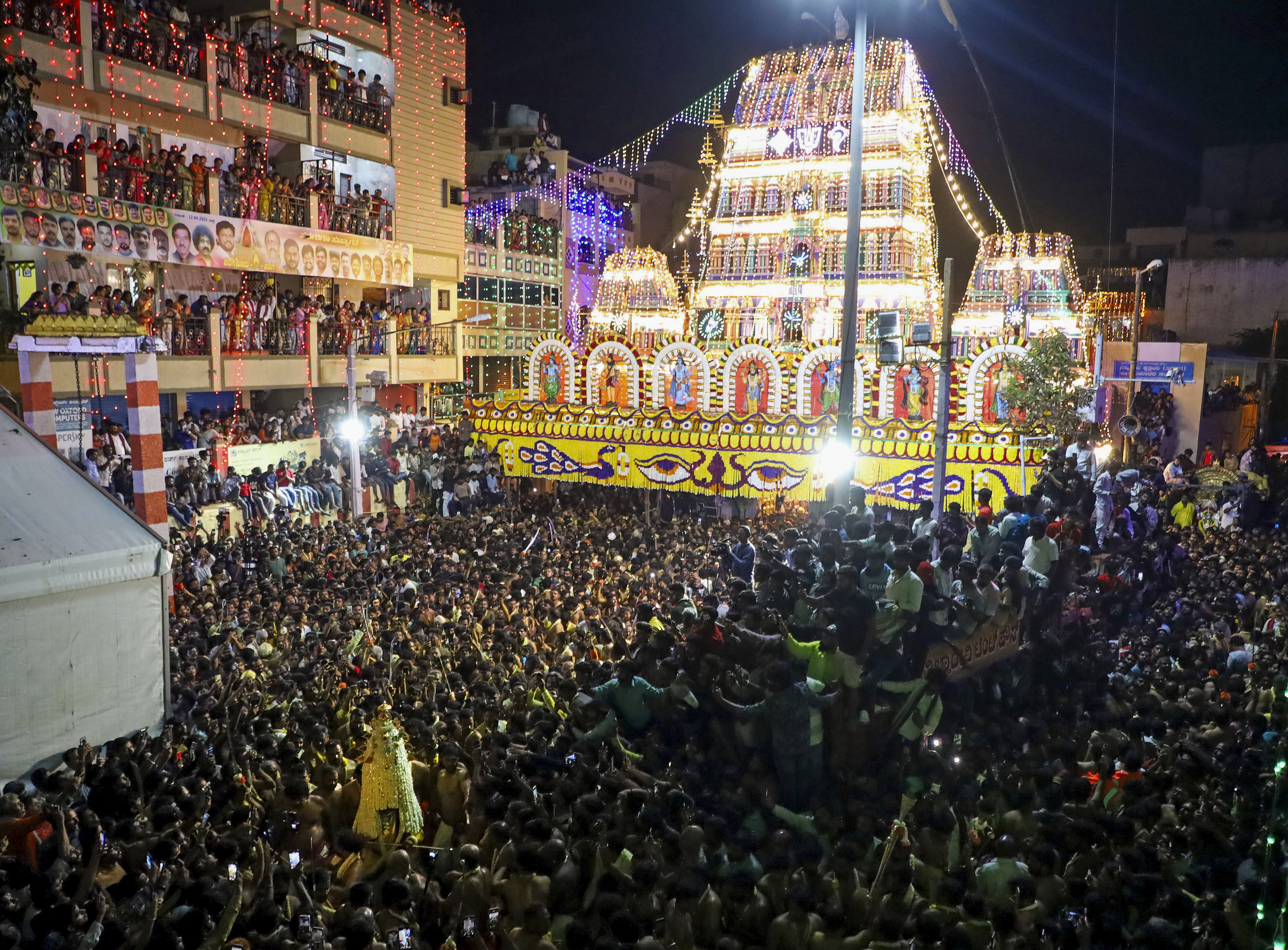 Bengaluru: A priest carries the sacred flower pot ‘Karaga’ on his head during a procession as part of the Karaga festival, at Shri Dharmaraya Swamy Temple, in Bengaluru, early Sunday morning, April 13, 2024. (PTI Photo)(PTI04_13_2025_000144B)