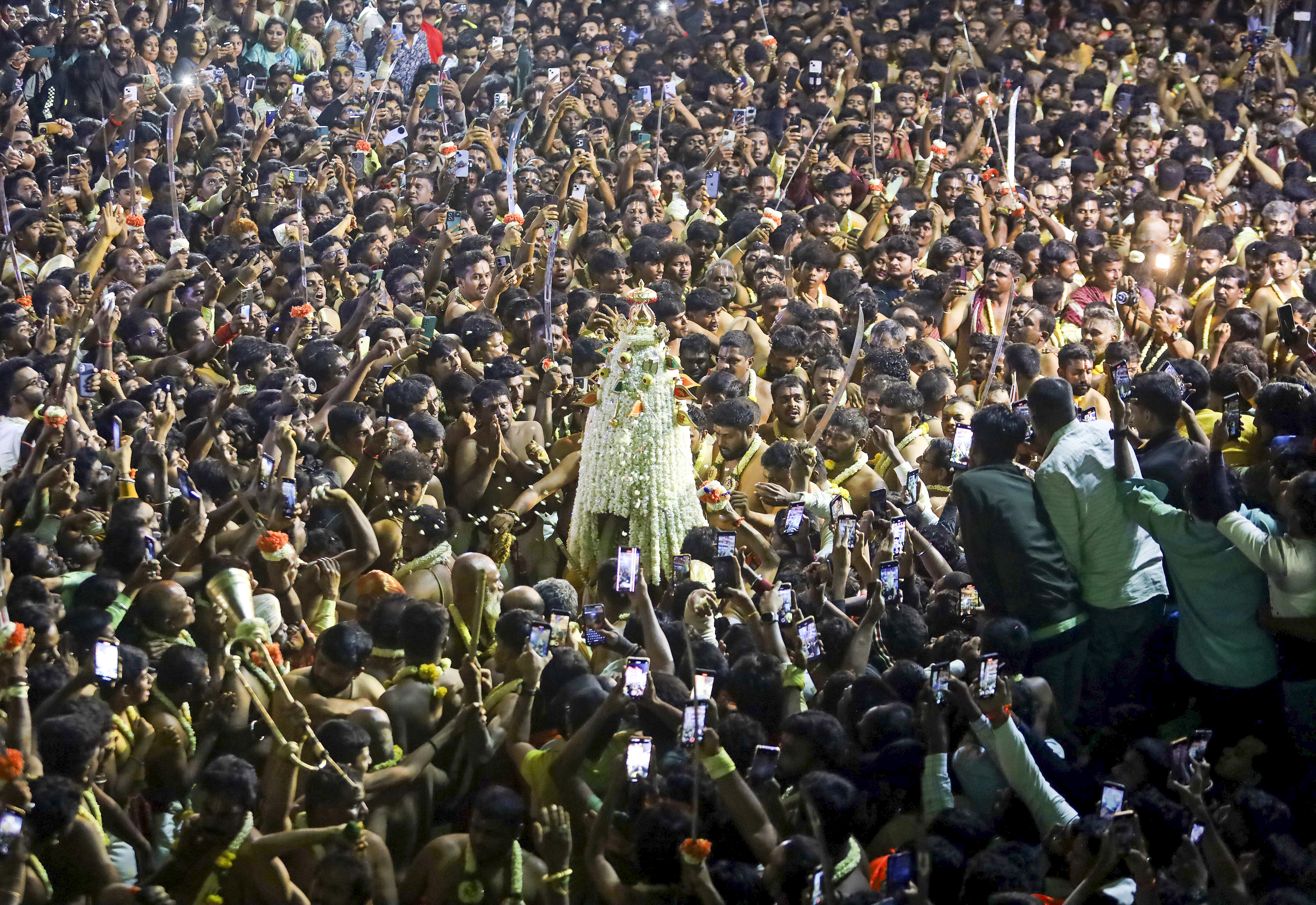 Bengaluru: A priest carries the sacred flower pot ‘Karaga’ on his head during a procession as part of the Karaga festival, at Shri Dharmaraya Swamy Temple, in Bengaluru, early Sunday morning, April 13, 2024. (PTI Photo)(PTI04_13_2025_000141B)