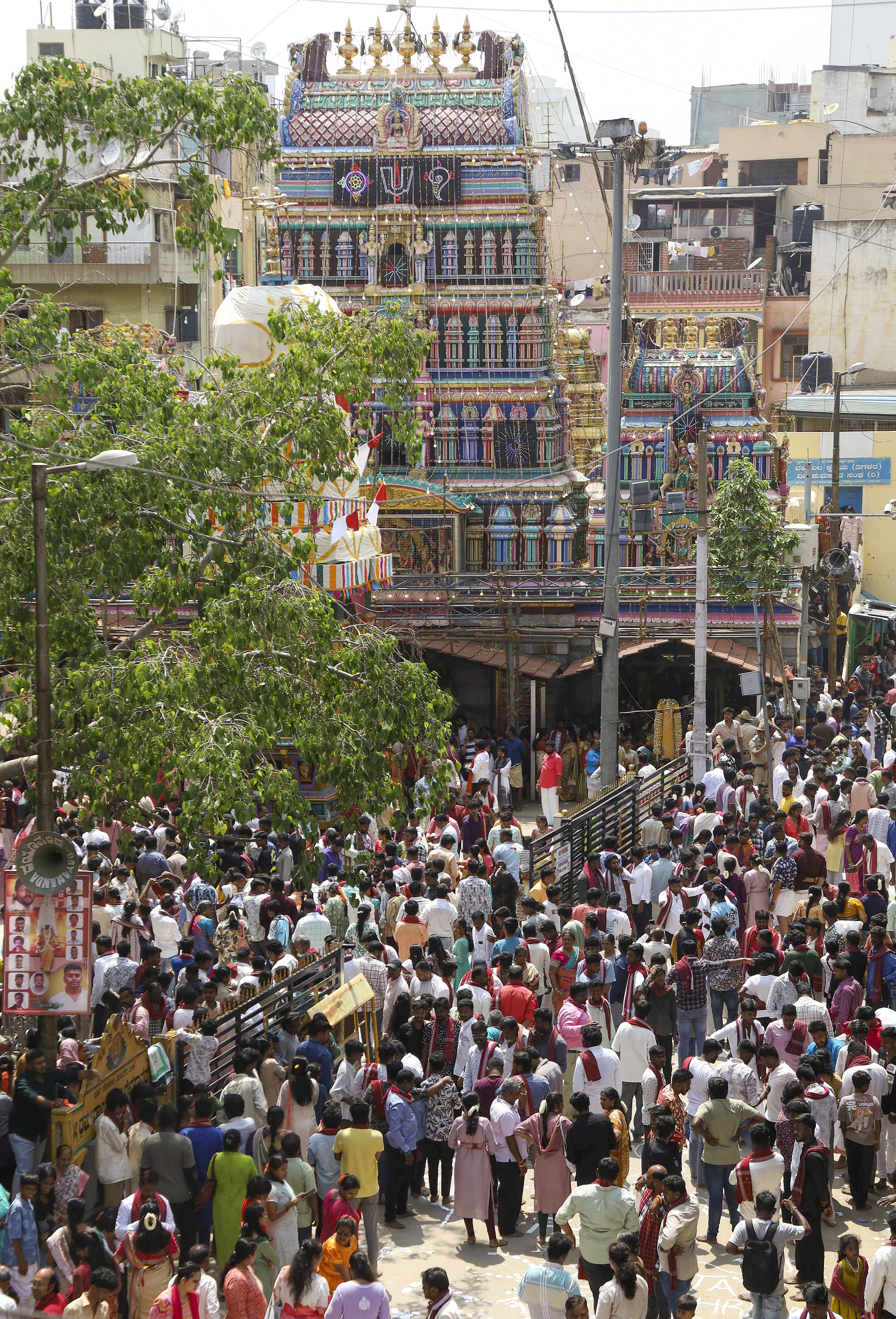 Bengaluru: People participate in camphor lighting on the Dharmaraya temple street ahead of the Karaga festival procession in Bengaluru, Karnataka, Saturday, April 12, 2025. The Karaga procession will start from the temple late night and end on Sunday morning. (PTI Photo) (PTI04_12_2025_000253B)