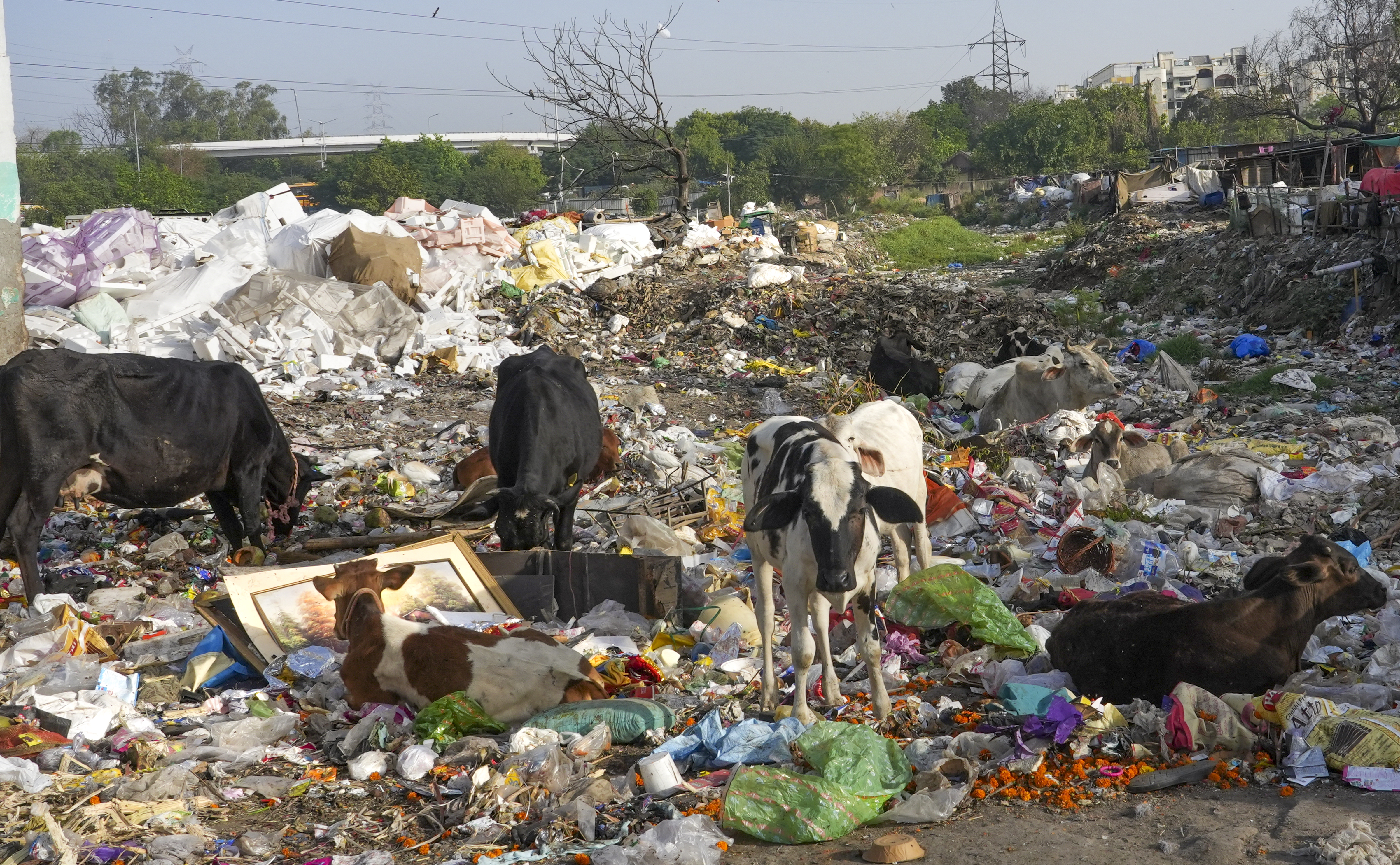 New Delhi: Cows at a garbage-dumping site on Earth Day 2025, in east Delhi, Tuesday, April 22, 2025. Earth Day is celebrated every year to spread awareness to protect our environment. (PTI Photo/Manvender Vashist Lav) (PTI04_22_2025_000091B)