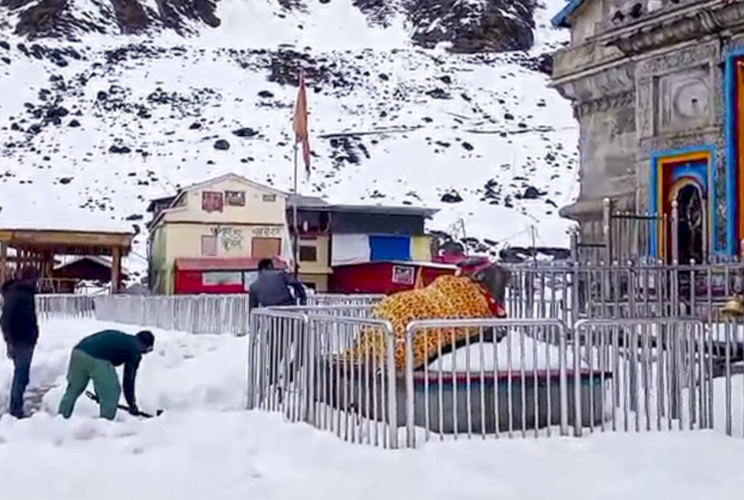 Rudraprayag: Workers clear the snow near the ‘Kedarnath Temple’, in Rudraprayag district, Uttarakhand, Sunday, March 29, 2026. (PTI Photo)(PTI03_29_2026_000094B)