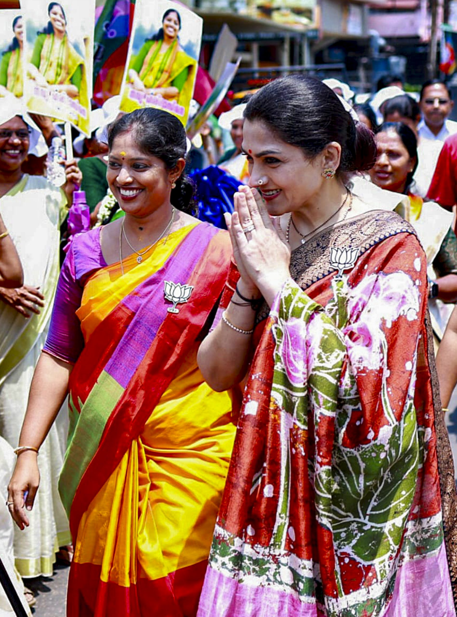 Kozhikode: BJP Tamil Nadu Vice-President Khushbu Sundar, front, greets the gathering during an election campaign in support of NDA candidate for Kozhikode North constituency, Navya Haridas, behind, ahead of the Kerala Assembly Election, in Kozhikode district, Tuesday, March 31, 2026. (PTI Photo)(PTI03_31_2026_000255B)