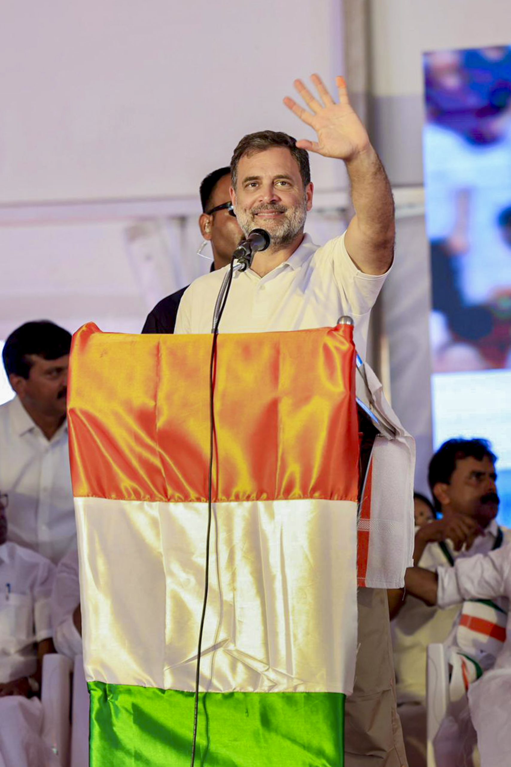 **EDS: THIRD PARTY IMAGE** In this image posted on March 30, 2026, Lok Sabha LoP and Congress MP Rahul Gandhi greets the gathering at a public rally ahead of the Kerala Assembly Election, in Pathanamthitta district, Kerala. (@INCIndia/X via PTI Photo)(PTI03_30_2026_000245B)