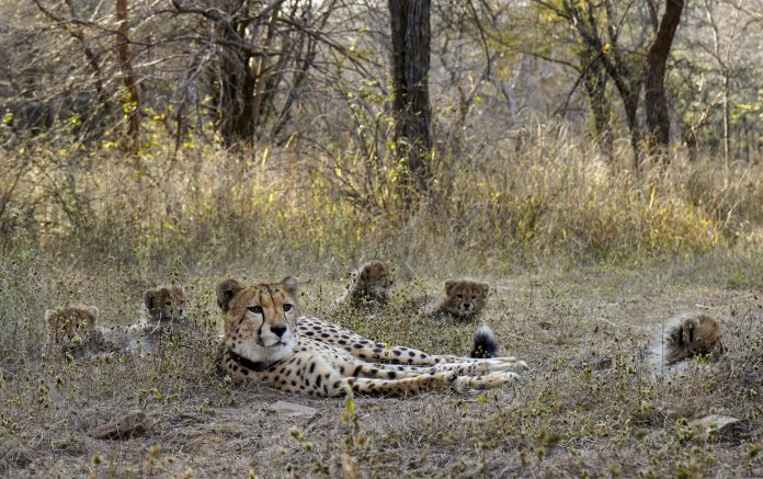 **EDS: THIRD PARTY IMAGE; TO GO WITH STORY BOM11** In this image received on March 29, 2026, Mukhi is seen with its cubs at the Kuno National Park, in Sheopur district, Madhya Pradesh. Mukhi, the first cheetah born in India following an ambitious reintroduction programme that began in September 2022 in the national park, turned three on Sunday, March 29, 2026, officials said. (Kuno National Park via PTI Photo) (PTI03_29_2026_000419B)