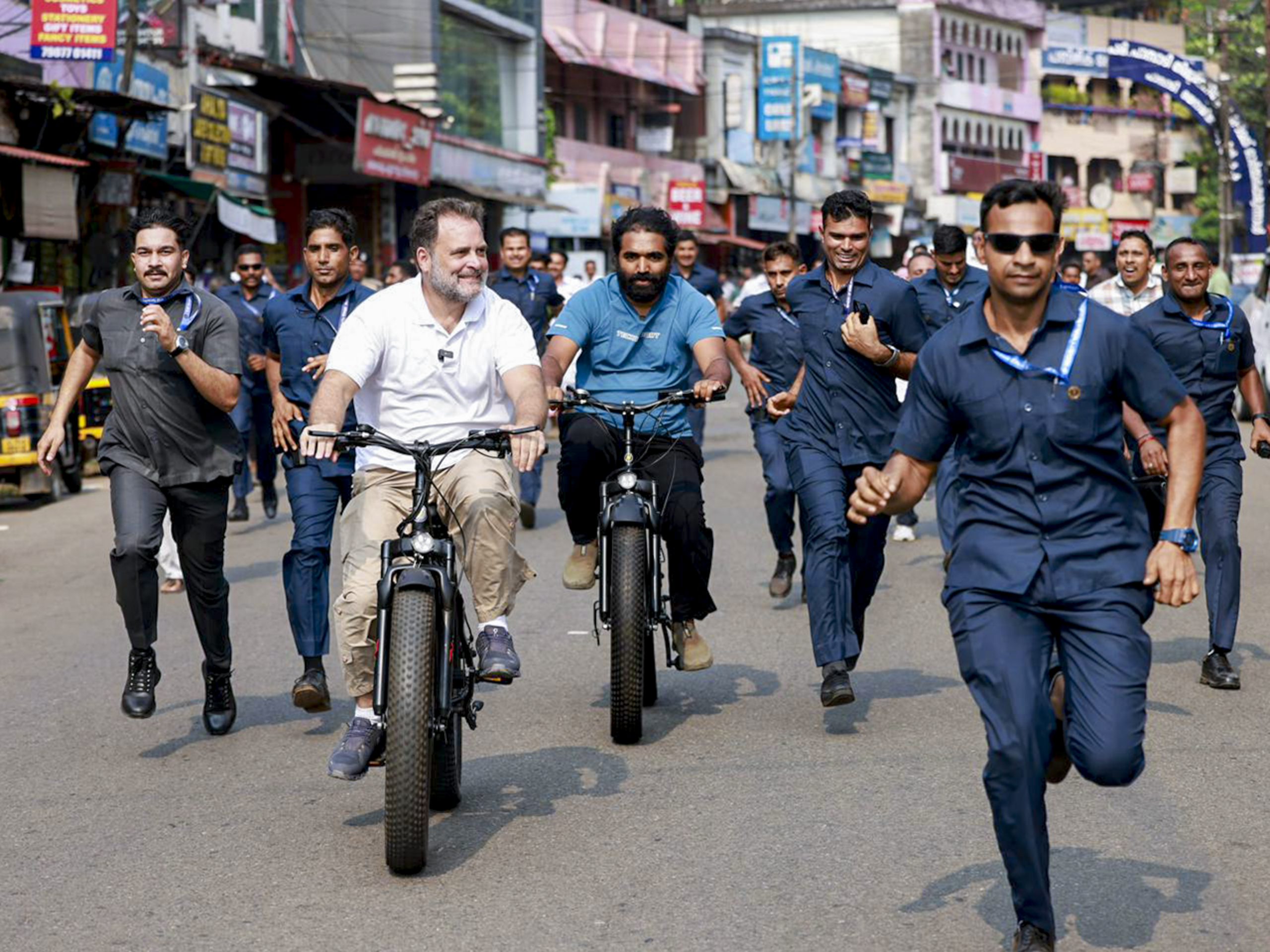 **EDS: THIRD PARTY IMAGE** In this image posted on March 30, 2026, Congress leader Rahul Gandhi rides a bicycle as he campaigns in support of UDF candidate Chandy Oommen, cycling behind, from Puthuppally constituency, ahead of the upcoming Kerala Assembly elections, in Kottayam district. (@INCIndia/X via PTI Photo) (PTI03_30_2026_000303B) *** Local Caption ***