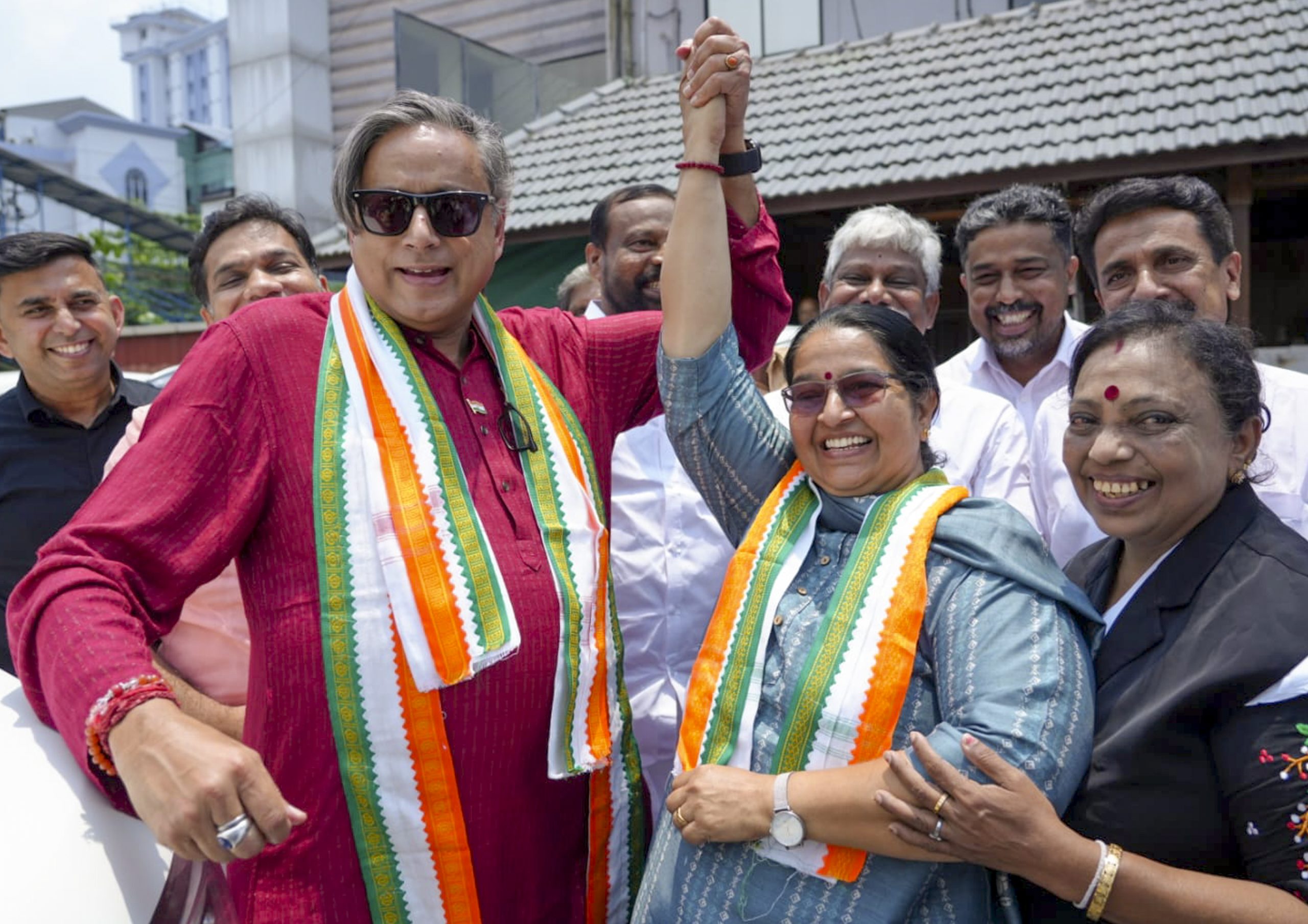 Kochi: Congress MP Shashi Tharoor campaigns in support of UDF candidate from Thrikkakara constituency Uma Thomas ahead of the Kerala Assembly elections, in Kochi, Saturday, March 28, 2026. (PTI Photo) (PTI03_28_2026_000289B)