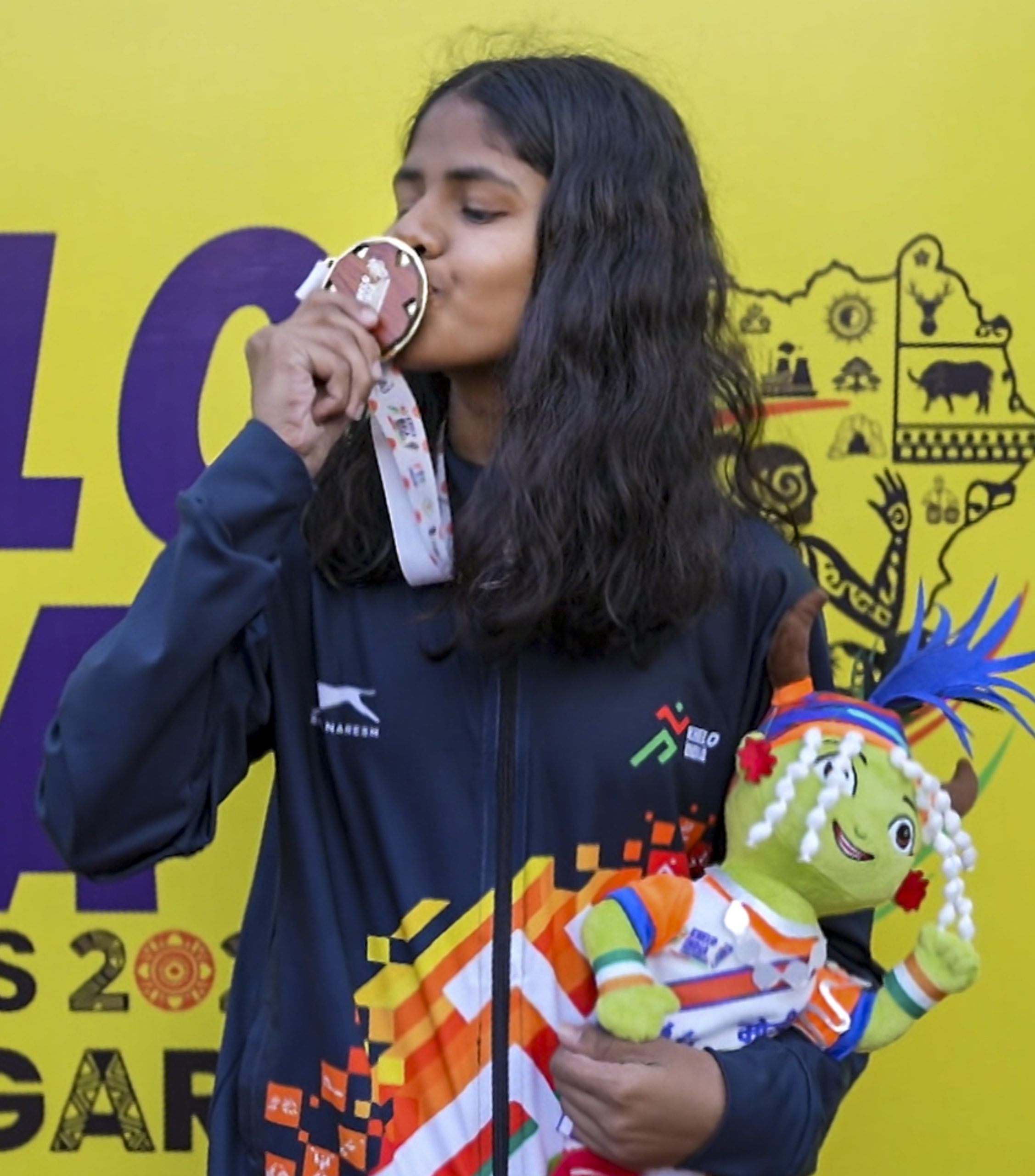 **EDS: THIRD PARTY IMAGE; SPECIAL PACKAGE** In this image received on April 1, 2026, A winner poses for a picture with her medal during the Khelo India Tribal Games (KITG) 2026, in Raipur, Chhattisgarh. (Handout via PTI Photo)(PTI04_01_2026_000226B)