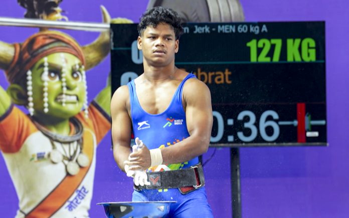 **EDS: THIRD PARTY IMAGE; SPECIAL PACKAGE** In this image received on April 1, 2026, A weightlifter prepares before attempting to lift during the Khelo India Tribal Games (KITG) 2026, in Raipur, Chhattisgarh. (Handout via PTI Photo)(PTI04_01_2026_000227B)