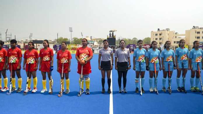 **EDS: THIRD PARTY IMAGE; SPECIAL PACKAGE** In this image received on April 1, 2026, Players in red and blue jersey take part in women’s hockey competion during the Khelo India Tribal Games (KITG) 2026, in Raipur, Chhattisgarh. (Handout via PTI Photo)(PTI04_01_2026_000224B)