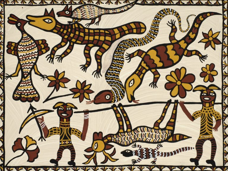 Sohrai is derived from the word soro that means to drive with a stick. This is widely done to celebrate the harvesting season. In this art, the red line is drawn first. It signifies the ‘blood of the ancestors’ and reproduction. The next line is black that signifies the everlasting dead stone and mark of the god, Shiva.