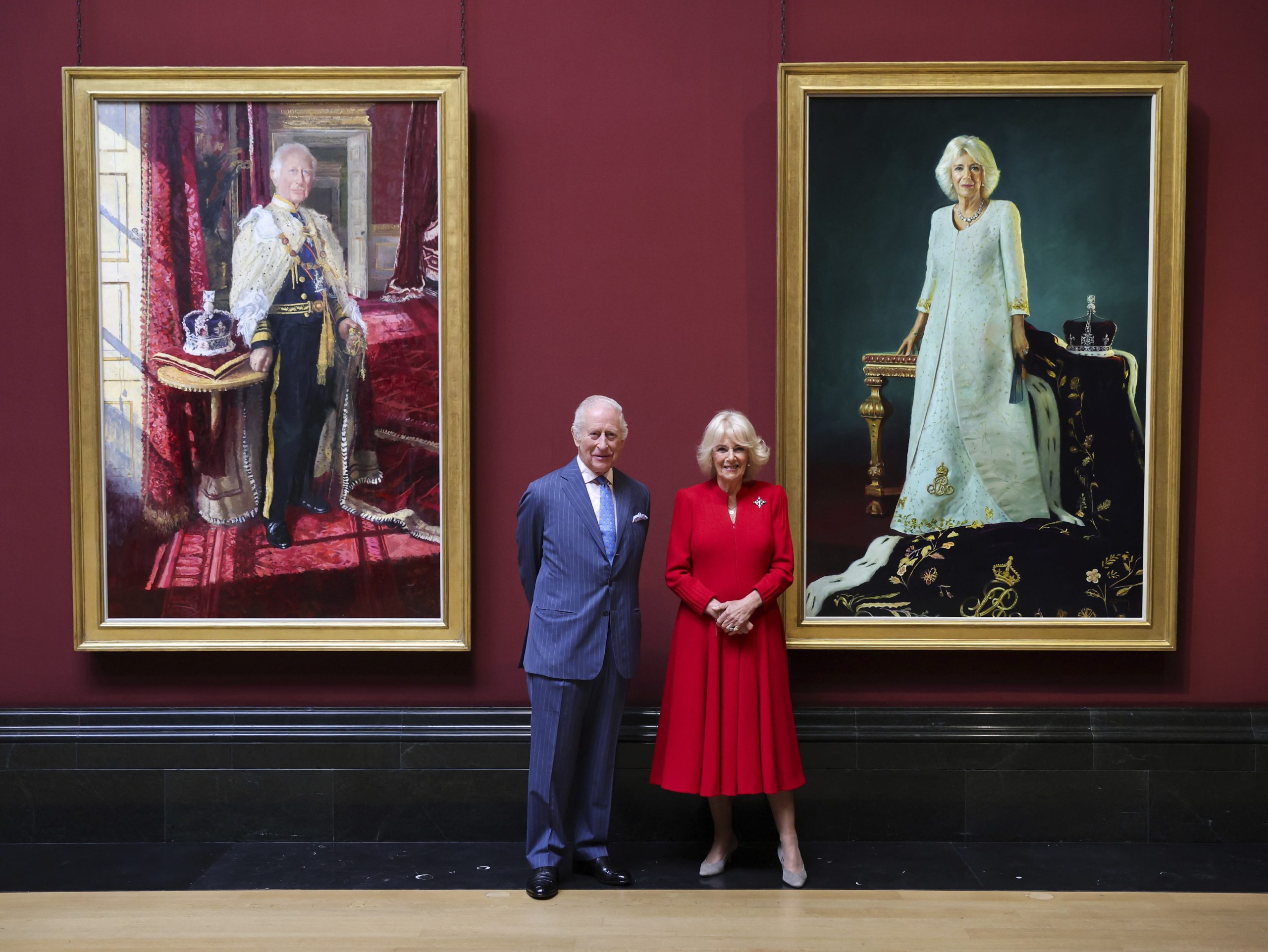 Britain's King Charles III and Queen Camilla pose with their official Coronation State Portraits during a visit to The National Gallery in London, England, Tuesday, May 6, 2025. (Pool Photo via AP/PTI)(AP05_06_2025_000182B)