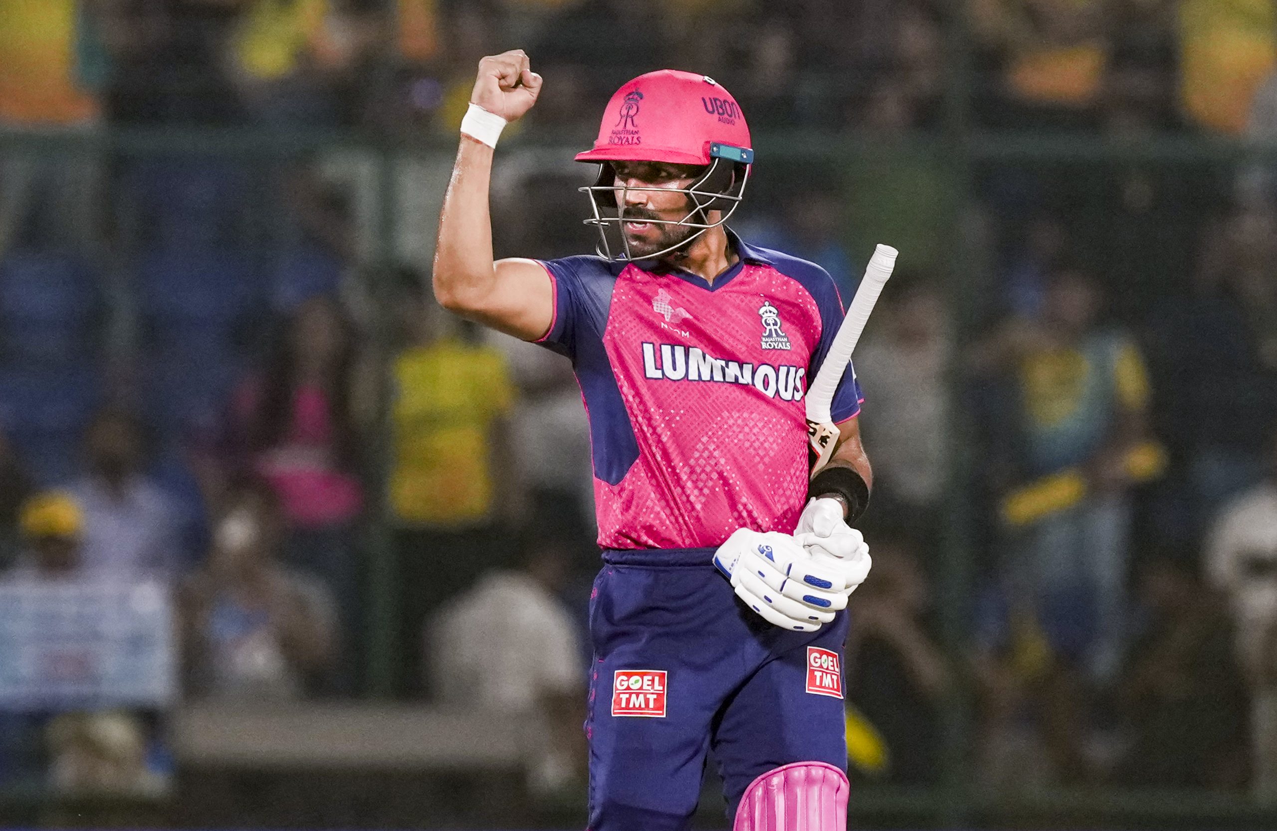 New Delhi: Rajasthan Royals' Dhruv Jurel celebrates his team's win in the IPL 2025 cricket match against Chennai Super Kings at the Arun Jaitley Stadium, in New Delhi, Tuesday, May 20, 2025. (PTI Photo/Manvender Vashist Lav) (PTI05_20_2025_000521B)