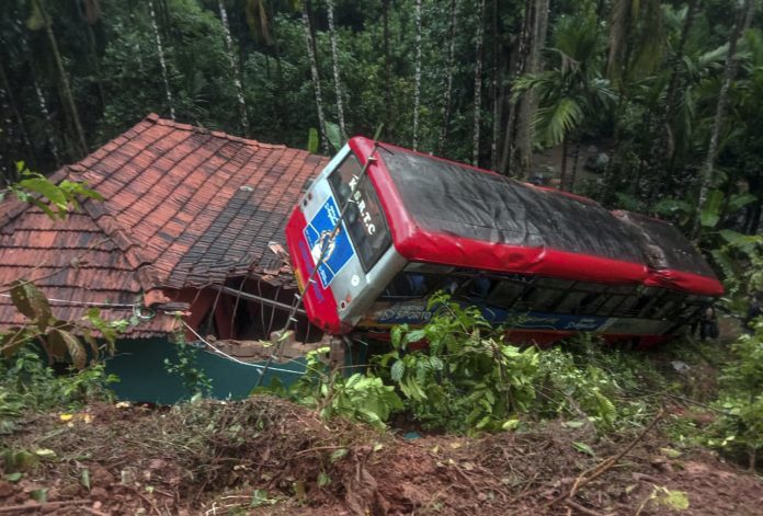 Chikkamagaluru: A KSRTC bus after falling off the road and hitting a house, in Chikkamagaluru district, Karnataka, Wednesday, April 9, 2025. (PTI Photo) (PTI04_09_2025_000581B)