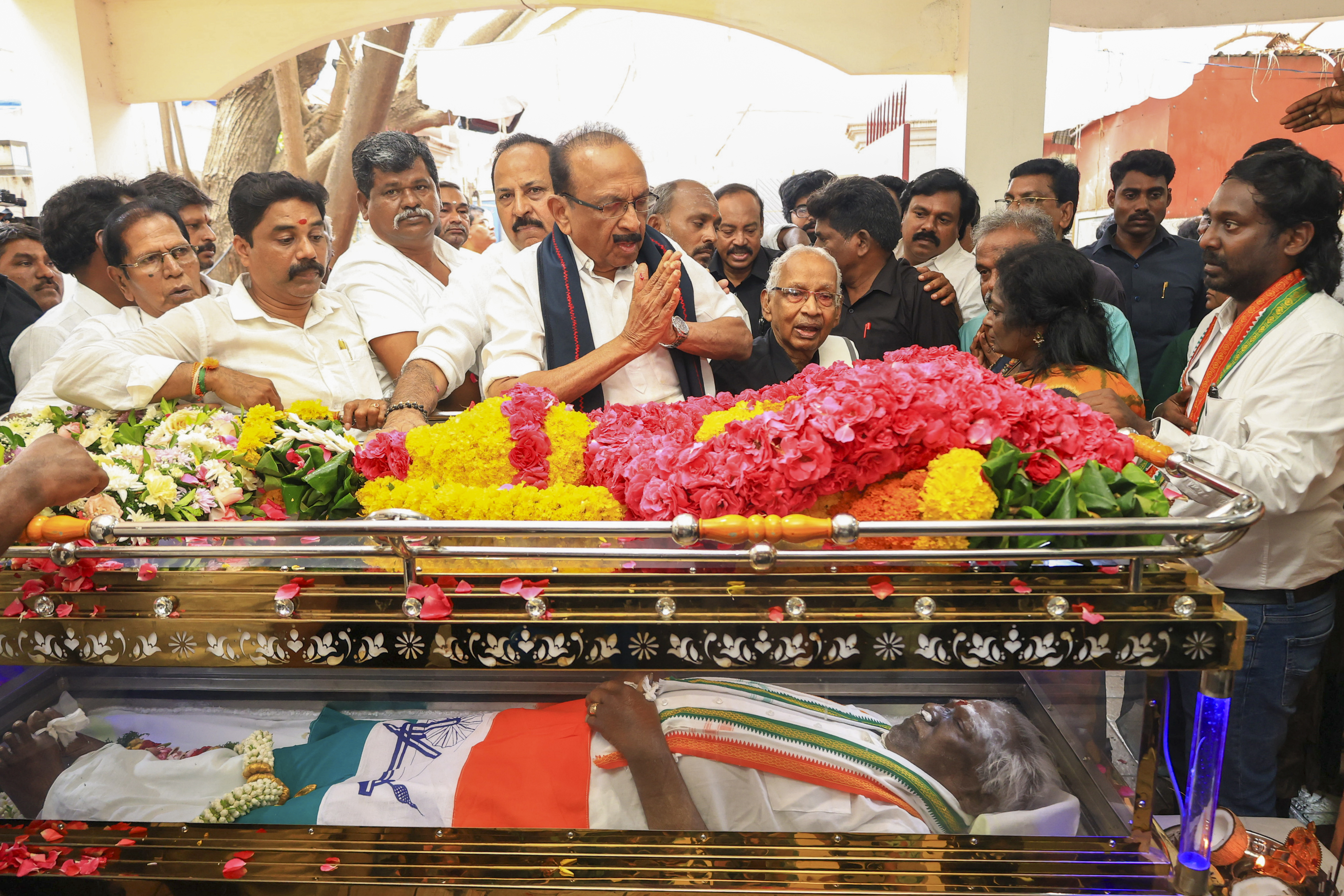 Chennai: MDMK chief Vaiko and DK chief K Veeramani pay their last respects to former Tamil Nadu Congress leader Kumari Ananthan who passed away at the age of 93 due to age-related illness, in Chennai, Wednesday, April 9, 2025. (PTI Photo) (PTI04_09_2025_000214B) *** Local Caption ***