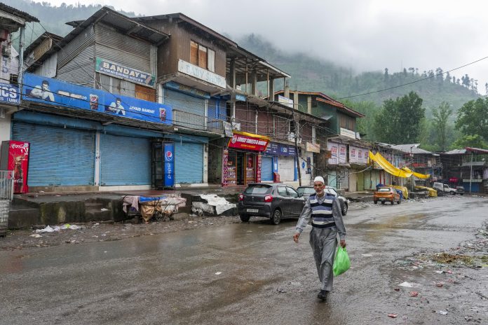 Baramulla: An elderly person walks along a road at a market closed following shelling by Pakistani troops, at Uri in Baramulla district, Friday, May 9, 2025. (PTI Photo/S Irfan) (PTI05_09_2025_000159B) *** Local Caption ***