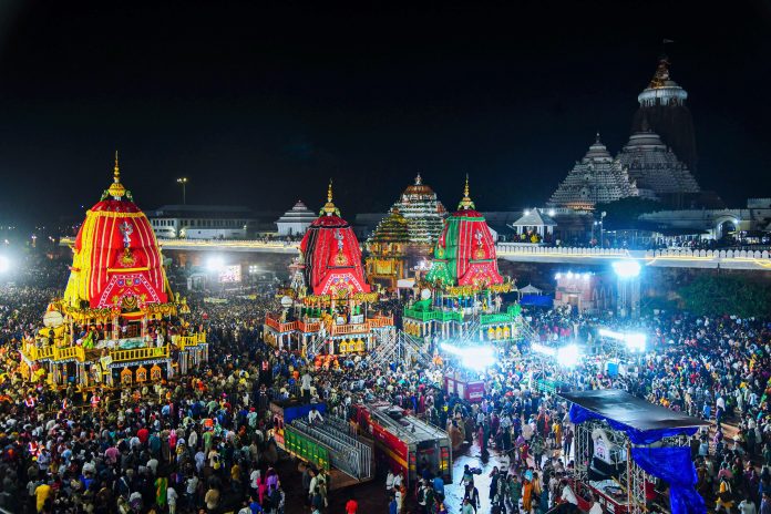 Amid chants like ‘Jai Jagannath’ and ‘Haribol’, lakhs of devotees pulled Lord Balabhadra’s chariot ‘Taladwaj’, ‘Darpadalan’ of Devi Subhadra and ‘Nandighosh’ of Jagannath from Shree Guncicha Temple to the 12th-century shrine, covering a distance of 2.6 kilometres.