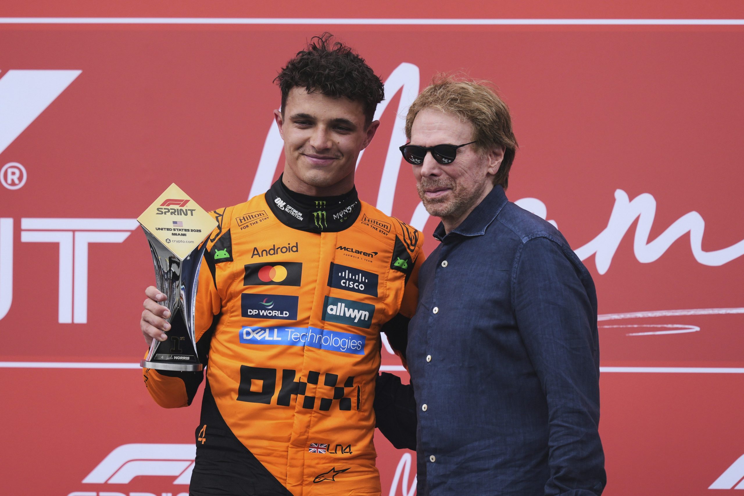 First place finisher McLaren driver Lando Norris, left, of Britain poses with director Jerry Bruckheimer during a trophy ceremony after the Sprint race at the Formula One Miami Grand Prix auto race, Saturday, May 3, 2025, in Miami Gardens, Fla. (AP/PTI)(AP05_03_2025_000563B)