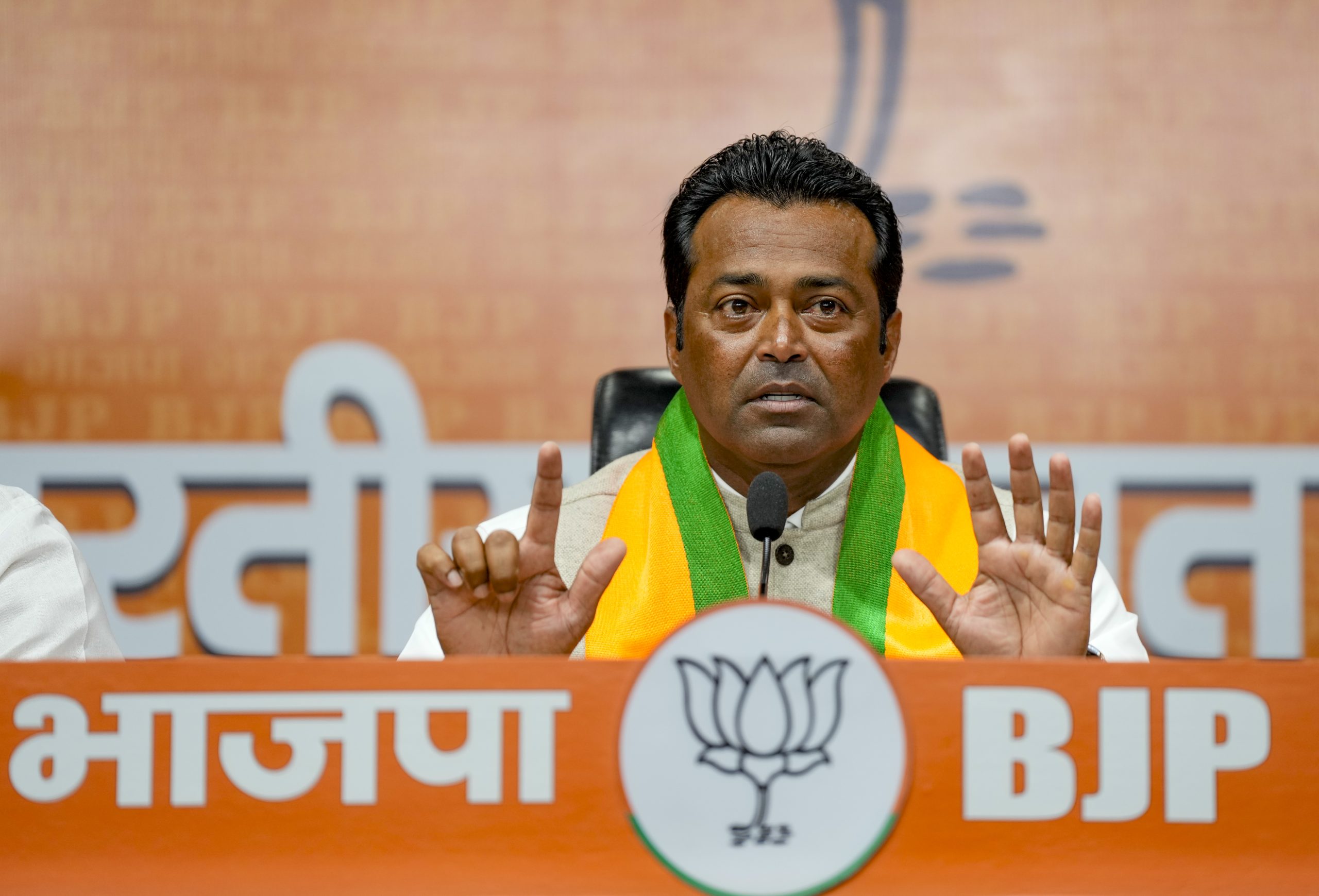 New Delhi: Former tennis player Leander Paes during his joining ceremony at the Bharatiya Janata Party (BJP) headquarters, in New Delhi, Tuesday, March 31, 2026. (PTI Photo/Salman Ali)(PTI03_31_2026_000138B)