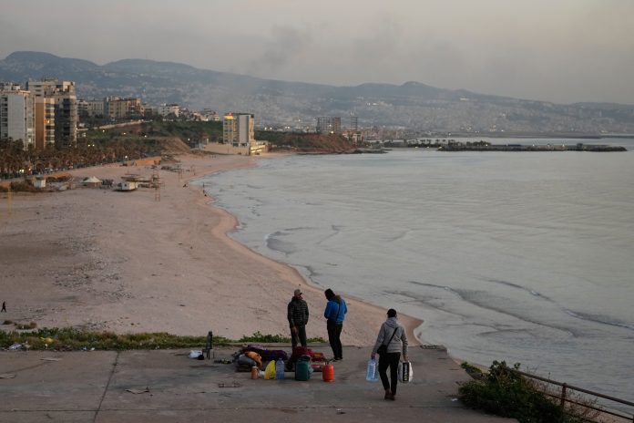 People displaced by Israeli airstrikes in Dahiyeh, Beirut's southern suburbs, gather with their belongings along the Mediterranean Sea in Beirut, Lebanon, Friday, March 6, 2026. (AP/PTI) (AP03_06_2026_000431B)