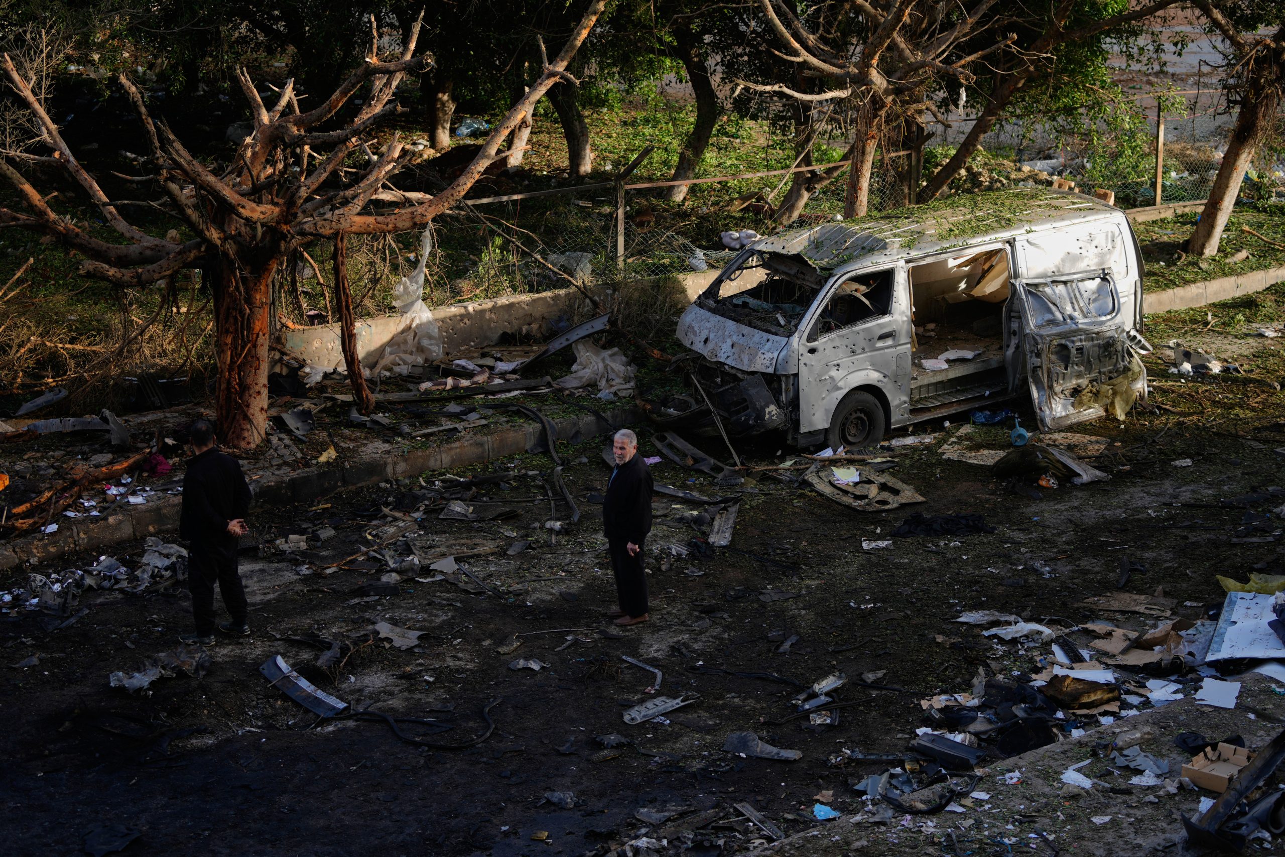 People stand near a damaged van beside scattered debris following an Israeli strike in Beirut, Lebanon, Wednesday, April 1, 2026. AP/PTI(AP04_01_2026_000087B)