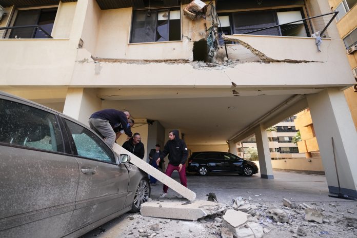 People remove debris from a damaged car at a site where a projectile carrying leaflets hit an apartment building in Beirut, Lebanon, Saturday, March 28, 2026. AP/PTI(AP03_28_2026_000175B)