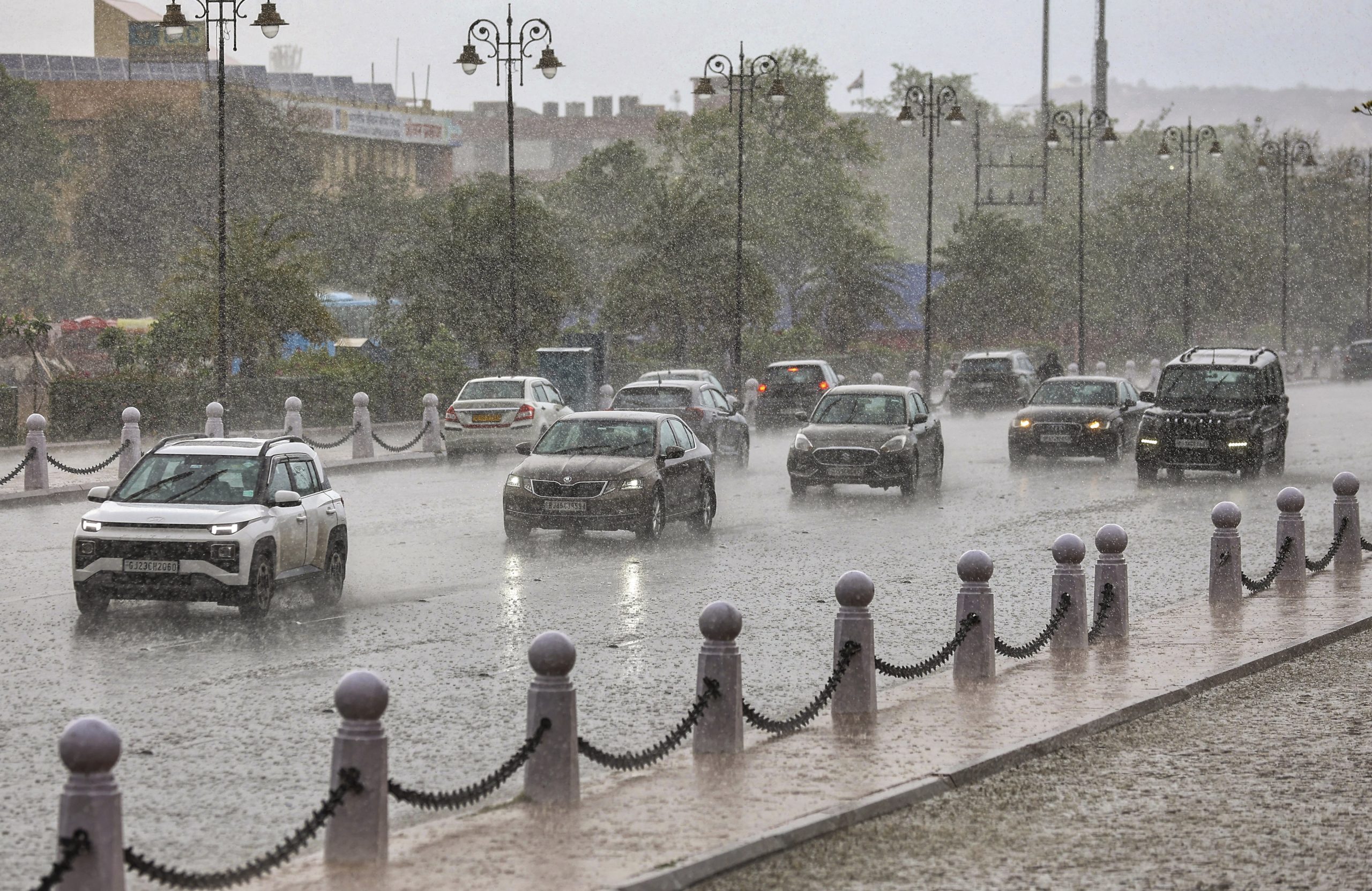 Jaipur: Vehicles ply on road amid rainfall, at Janpath, in Jaipur, Thursday, May 8, 2025. (PTI Photo) (PTI05_08_2025_000169B)