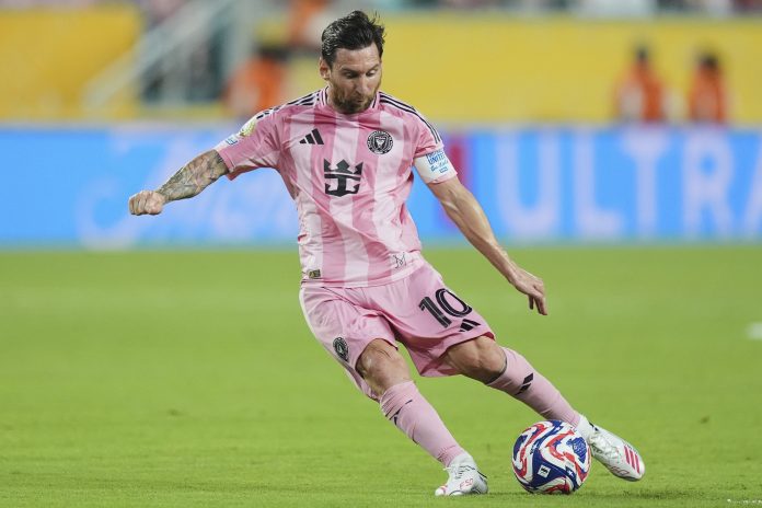 Inter Miami's Lionel Messi takes a free kick during the Club World Cup group A soccer match between Al Ahly and Inter Miami in Miami, Fla., Saturday, June 14, 2025.AP/PTI(AP06_15_2025_000049B)
