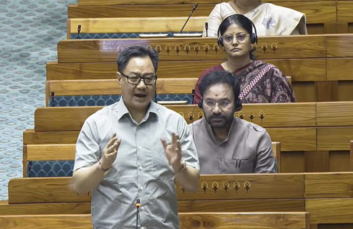 **EDS: THIRD PARTY IMAGE; SCREENGRAB VIA SANSAD TV** New Delhi: Union Minister for Parliamentary Affairs Kiren Rijiju speaks in the Lok Sabha during the second part of the Budget session of Parliament, in New Delhi, Wednesday, April 1, 2026. (Sansad TV via PTI Photo)(PTI04_01_2026_000082B)