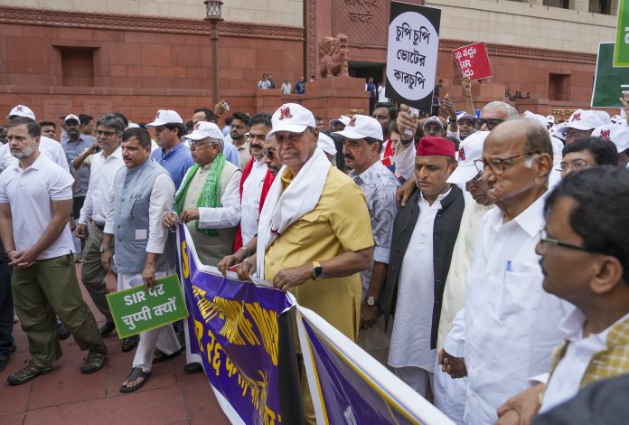 New Delhi: Leader of Opposition in the Lok Sabha Rahul Gandhi, DMK MP TR Baalu, NCP (SP) MP Sharad Pawar, Samajwadi Party (SP) MP Akhilesh Yadav, AAP MPs Sanjay Singh and Sandeep Pathak and others during a protest march by parliamentarians of the INDIA bloc from the Parliament House to the Election Commission of India's (ECI) office against the revision of electoral rolls in Bihar and alleged vote theft, in New Delhi, Monday, Aug. 11, 2025. (PTI Photo/Arun Sharma) (PTI08_11_2025_000416B)