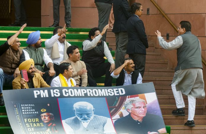 New Delhi: Congress MPs Gurjeet Singh Aujla, Hibi Eden, B. Manickam Tagore, CPI(M) MP S Venkatesan and other MPs who were suspended from the Lok Sabha on Tuesday for the remainder of the Budget session for "unruly behaviour'', stage a protest with a poster ‘'PM is compromised'’, at Parliament premises in New Delhi, Wednesday, Feb. 4, 2026. Union Minister Piyush Goyal also seen. (PTI Photo/Shahbaz Khan) (PTI02_04_2026_000138B)