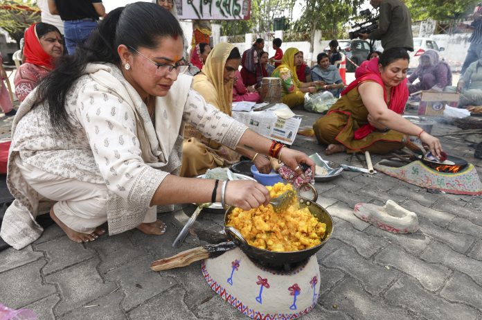 Jammu: Women cook food on traditional earthen stoves in view of the LPG supply crunch, in Jammu, Wednesday, March 25, 2026. (PTI Photo) (PTI03_25_2026_000192B)
