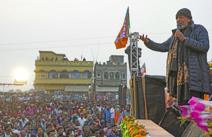 Birbhum: BJP leader and actor Mithun Chakraborty addresses the gathering during the 'Paribartan Sankalpa Yatra' ahead of the West Bengal Assembly elections, in Birbhum, Wednesday, Jan. 21, 2026. (PTI Photo) (PTI01_21_2026_000421B)