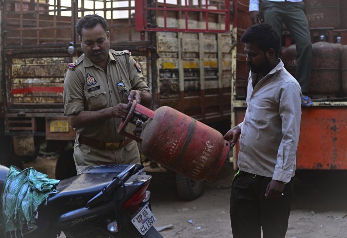 Prayagraj: A police personnel loads an LPG cylinder on a bike, amid supply crisis in the country, in Prayagraj, Uttar Pradesh, Friday, March 13, 2026. (PTI Photo)(PTI03_13_2026_000014B)